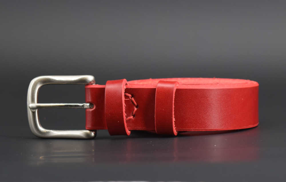 Belle ceinture rouge en cuir dont la boucle « Susie » est en laiton brossé. Cette ceinture est en cuir de vachette pleine fleur qui résistera à l’usure du temps. Son cuir, teinté en rouge vif dans la masse, est souple et s’accordera avec une tenue décontractée ou plus habillée. Elle convient autant à un homme qu’à une femme, et ajoutera du peps à une tenue .